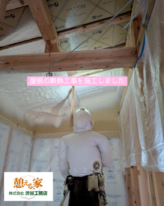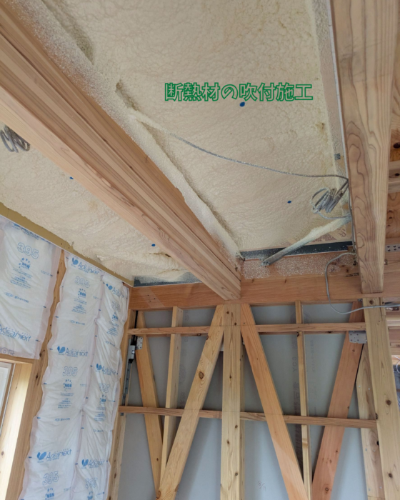 屋根の断熱材施工に伴い、周りを養生して断熱材を吹付施工しました。